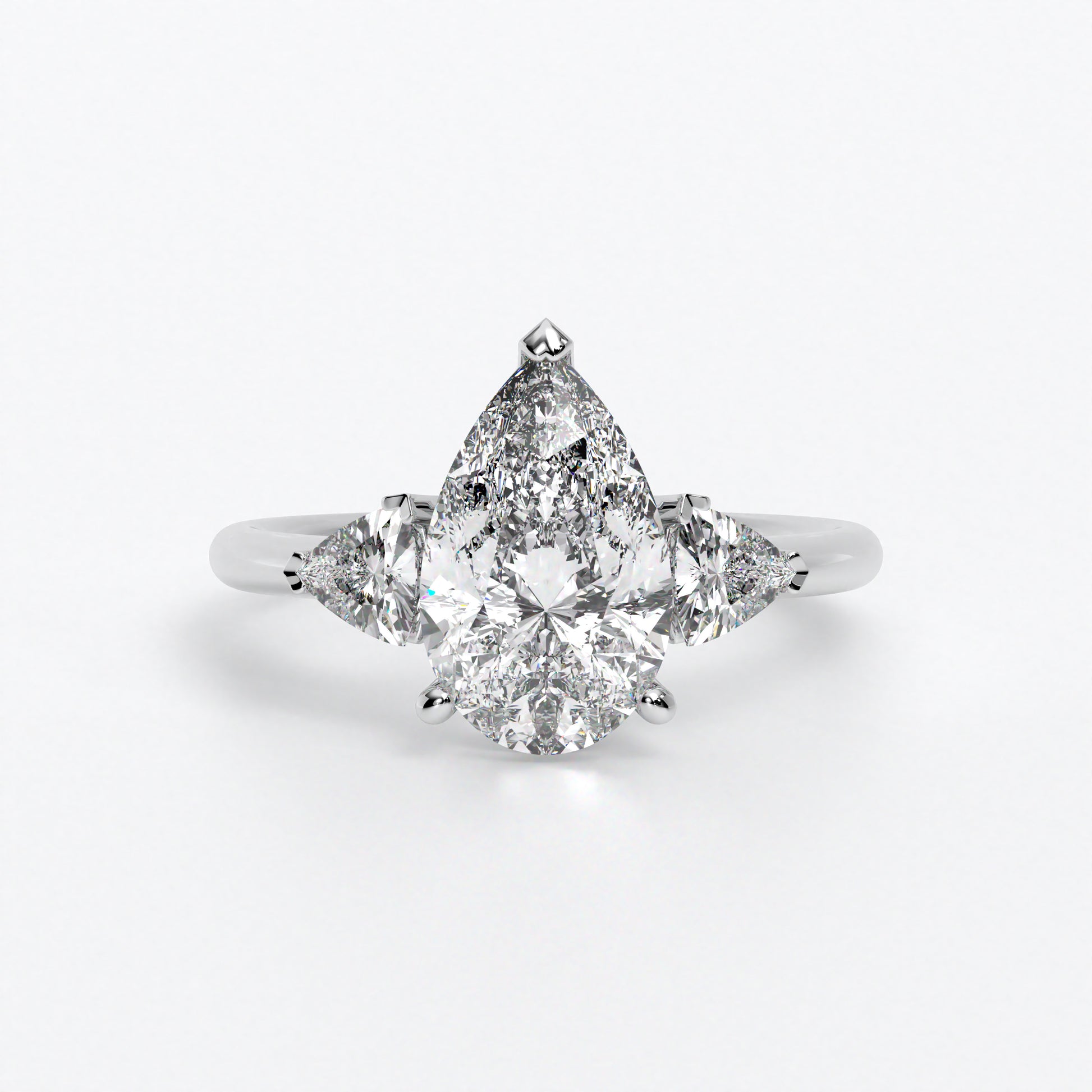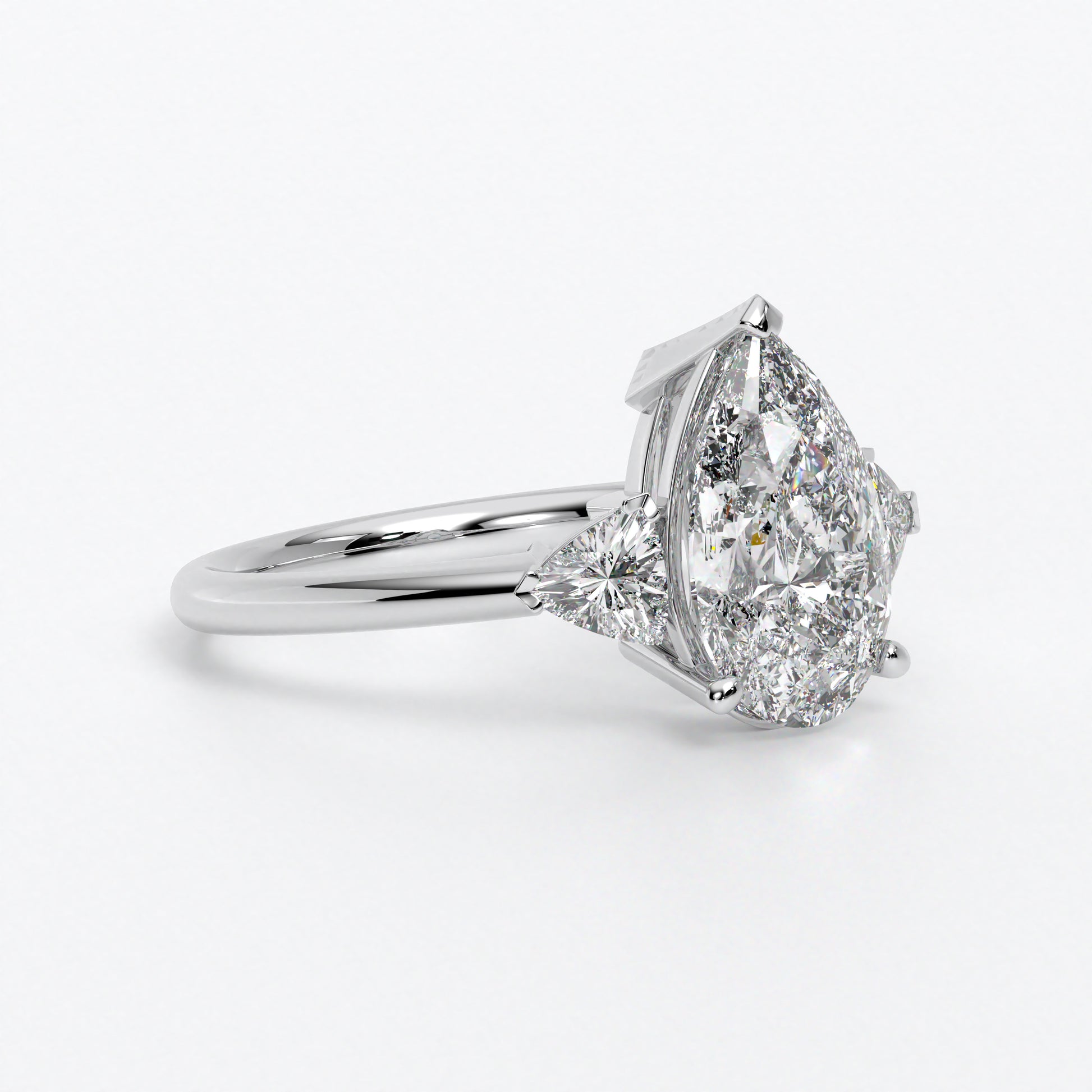 Anillo de oro blanco de 18K con diamante central en talla Pera , 2 diamantes en talla triángulo