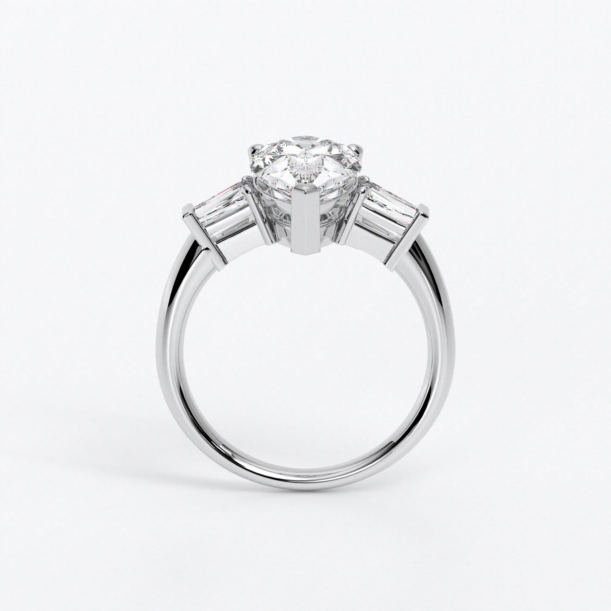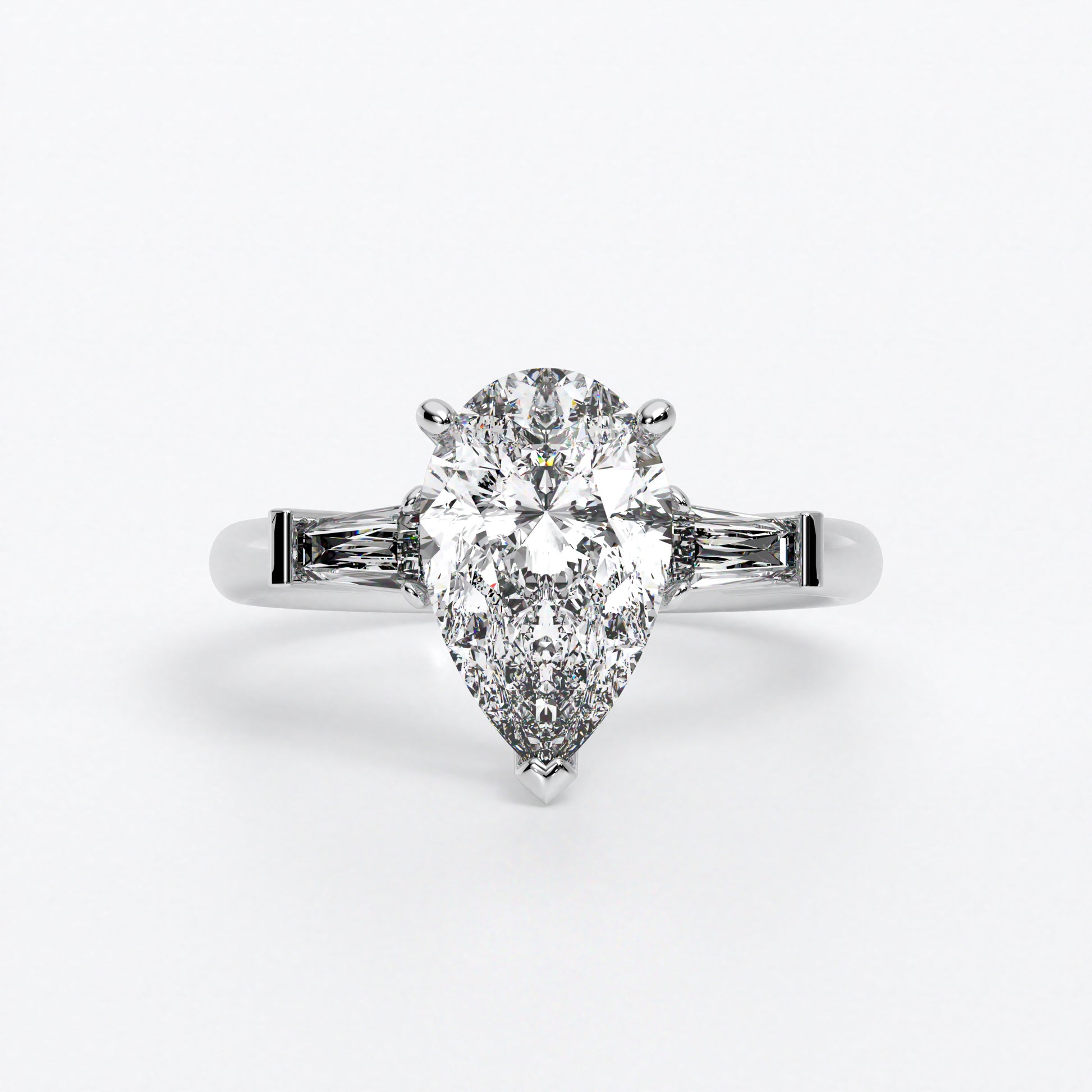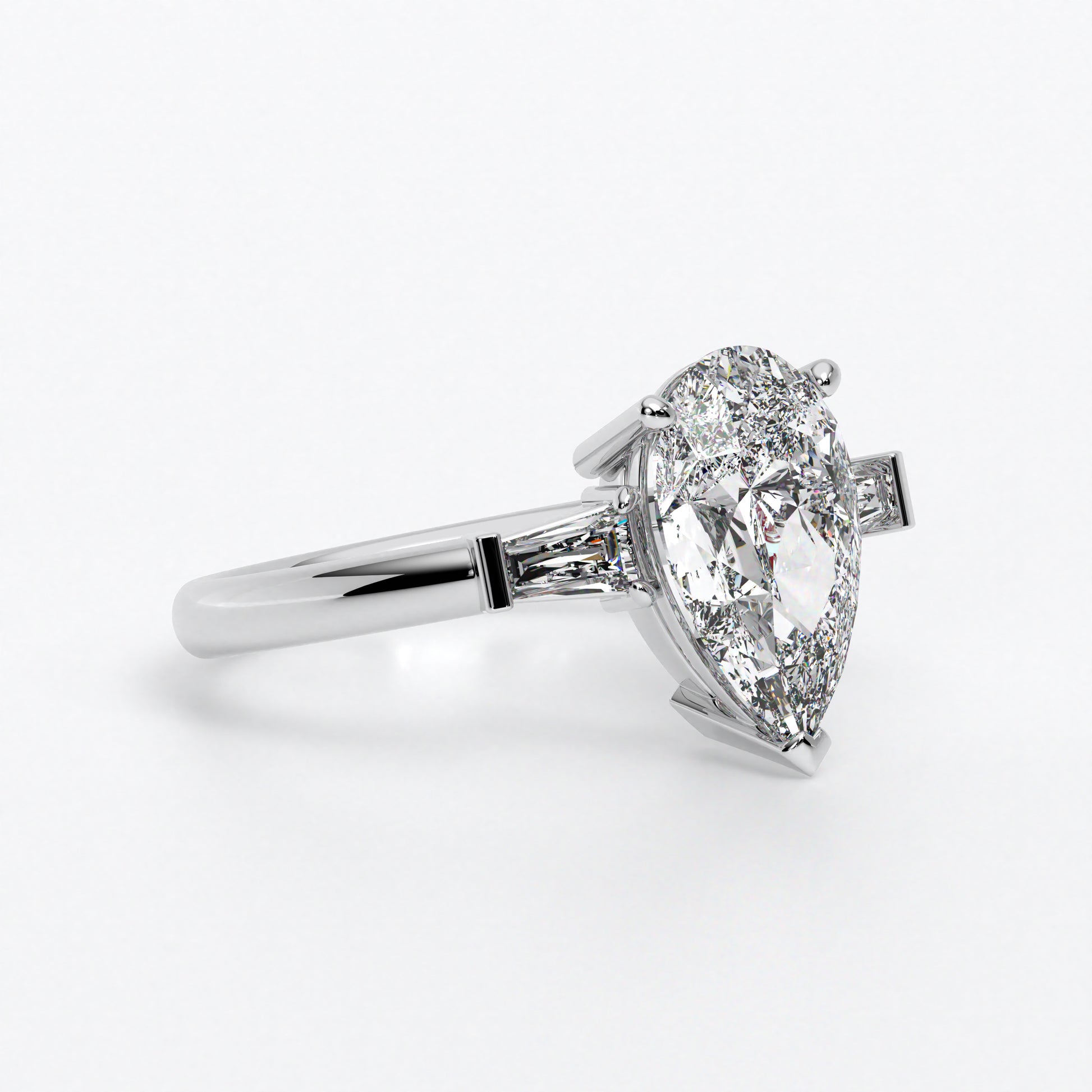 Anillo de oro blanco de 18K con diamante central en talla pera, 2 diamantes en talla trapecio